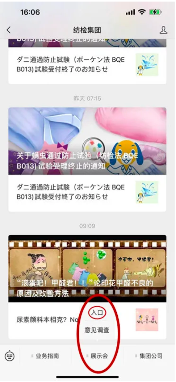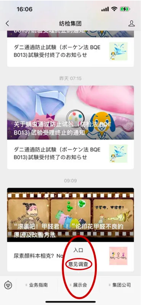 關(guān)注“紡檢集團”微信訂閱號后,點擊【展示會】菜單中的【意見調(diào)查】,即可報名和進入展示會界面。