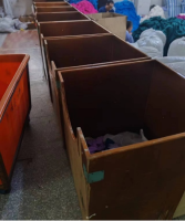 改善前:帶孔洞的周轉筐藏灰納垢,深色木質筐易掉色、掉渣,淺色服裝一沾就中招,臟污 + 異物混入投訴不斷!